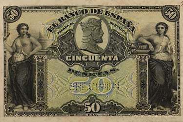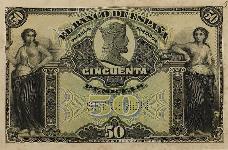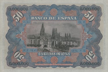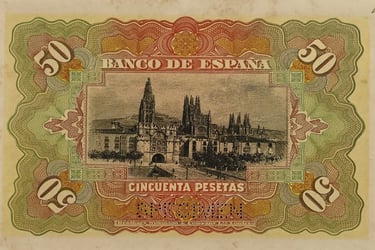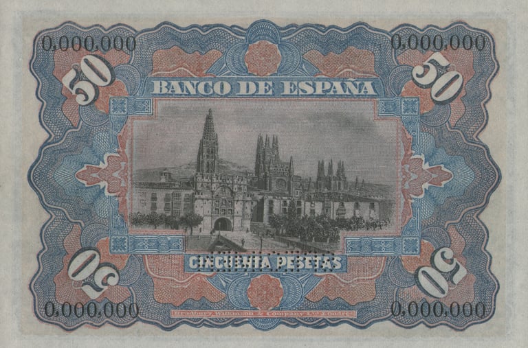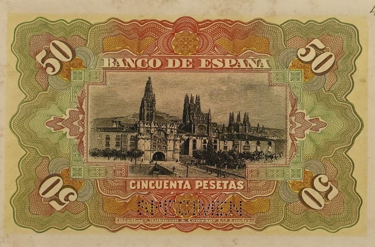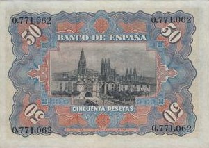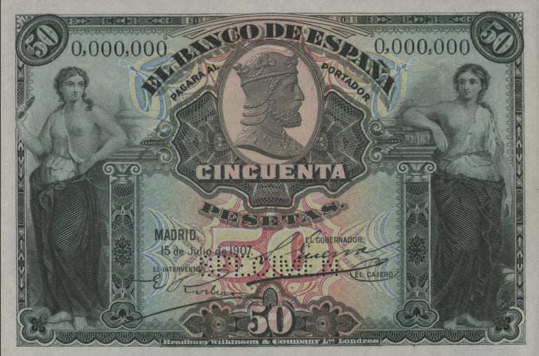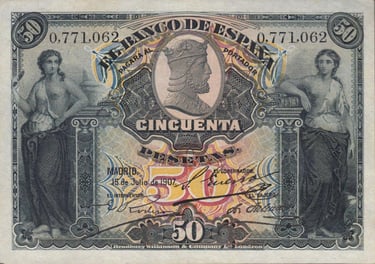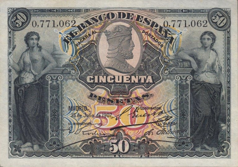 25 pesetas, 15 de julio 1907. Anverso, alegoría de la riqueza. Reverso, Patio de los leones en la Alhambra de Granada. Impreso en calcografía y litografía por Bradbury Wilkinson and Company. Tamaño 119 x 81 mm. Tirada: 8.000.000. Circulación: Agosto de 1926.