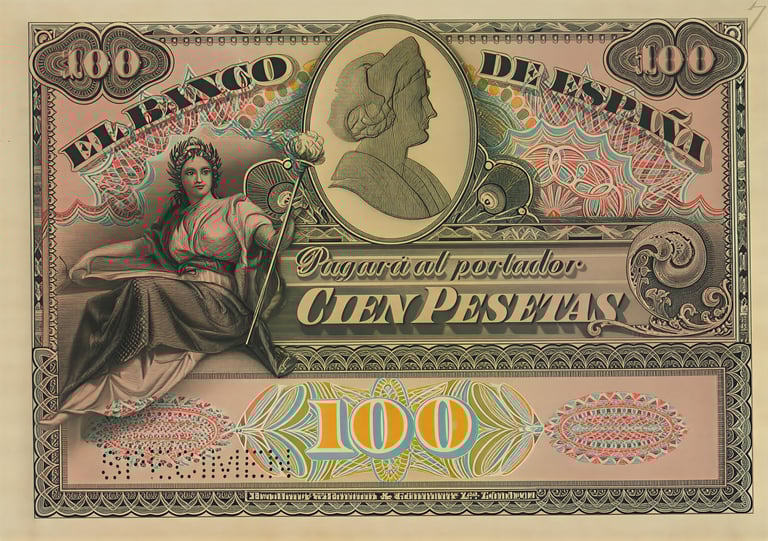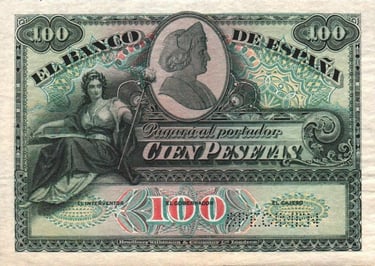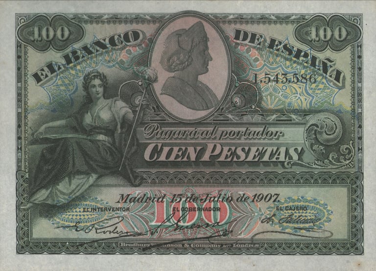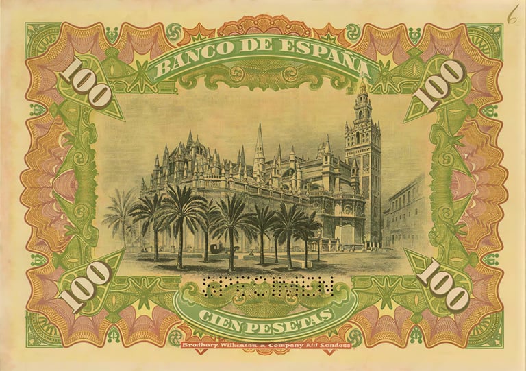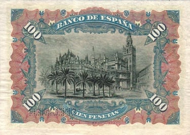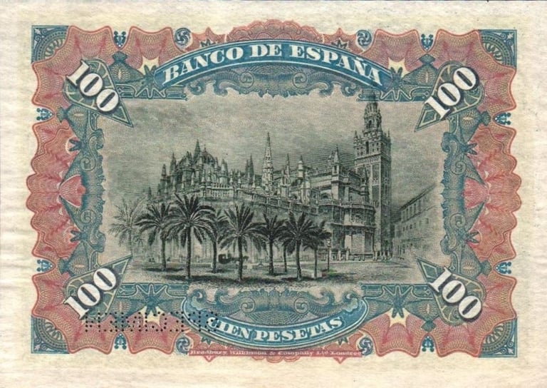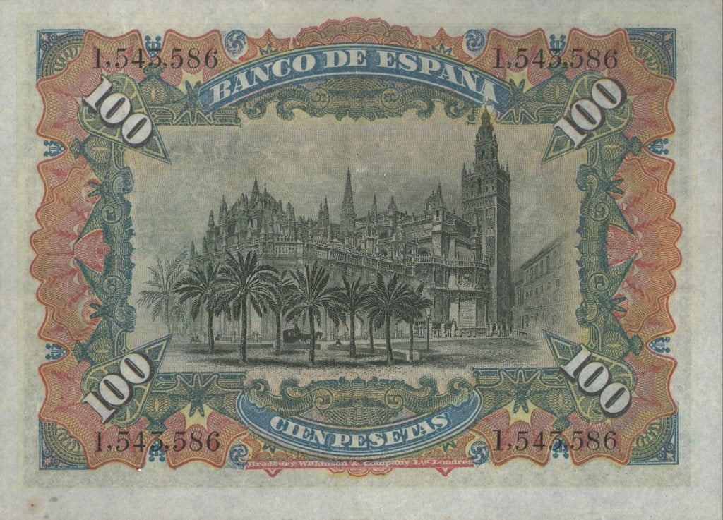 100 pesetas, 15 de julio 1907. Anverso, alegoría de la sabiduría y personaje femenino. Reverso, Catedral de Santa María de la Sede de Sevilla. Impreso en calcografía y litografía por Bradbury Wilkinson and Company. Tamaño: 139 x 101 mm.