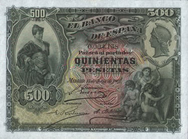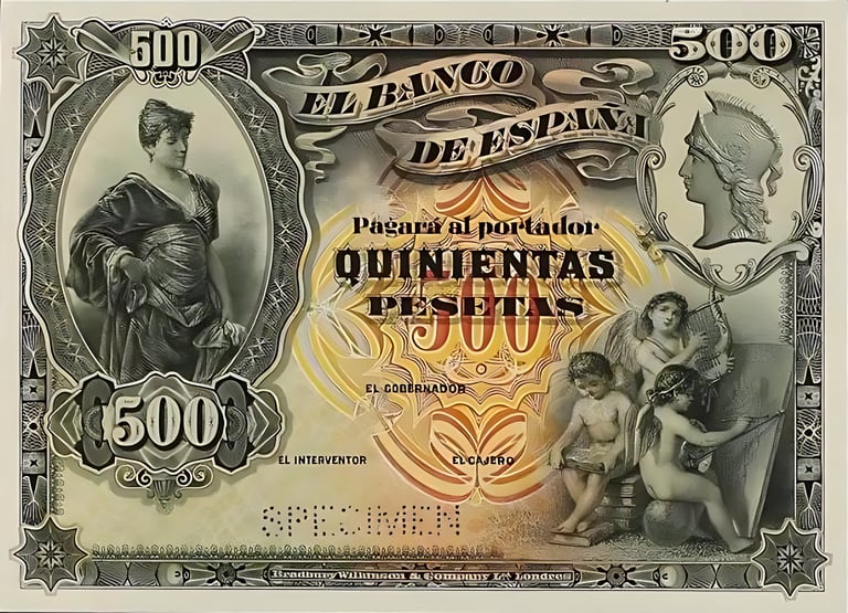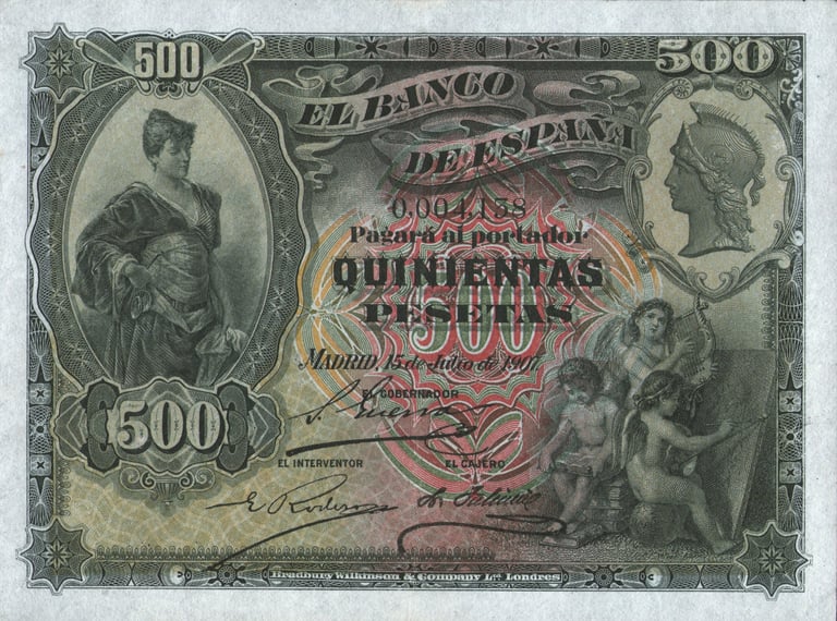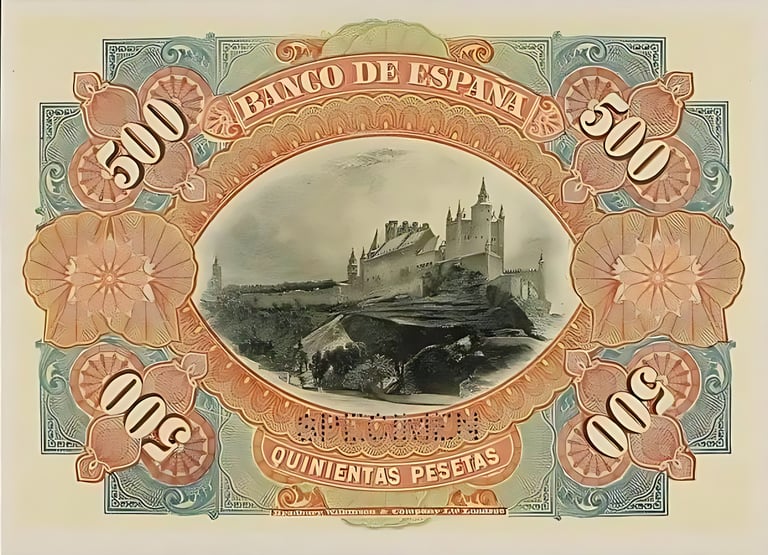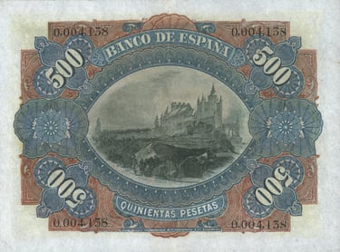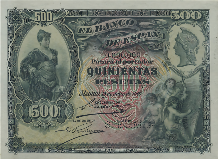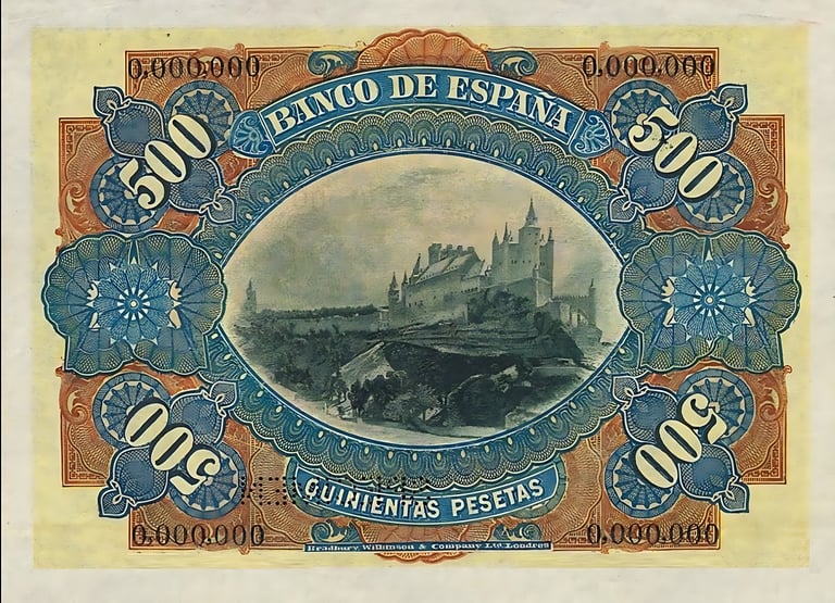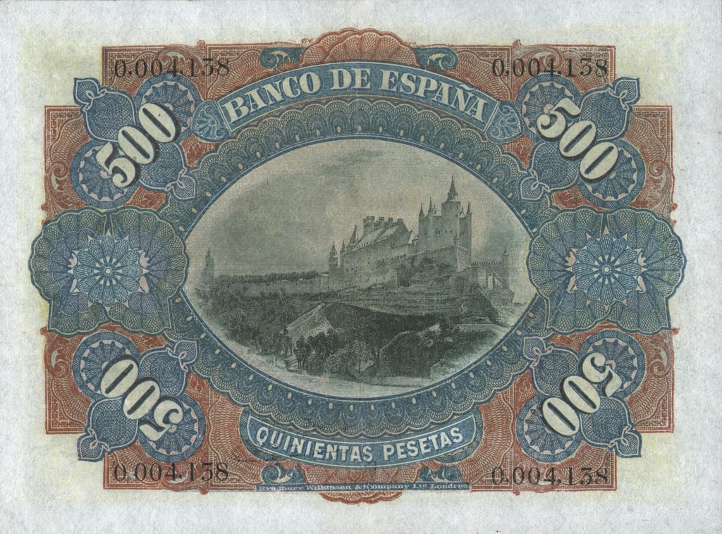 500 pesetas, 15 de julio 1907. Anverso, “Matrona y querubines alegóricos de las artes y la ciencia”. Reverso, Alcázar de Segovia. Impreso en calcografía y litografía por Bradbury.