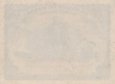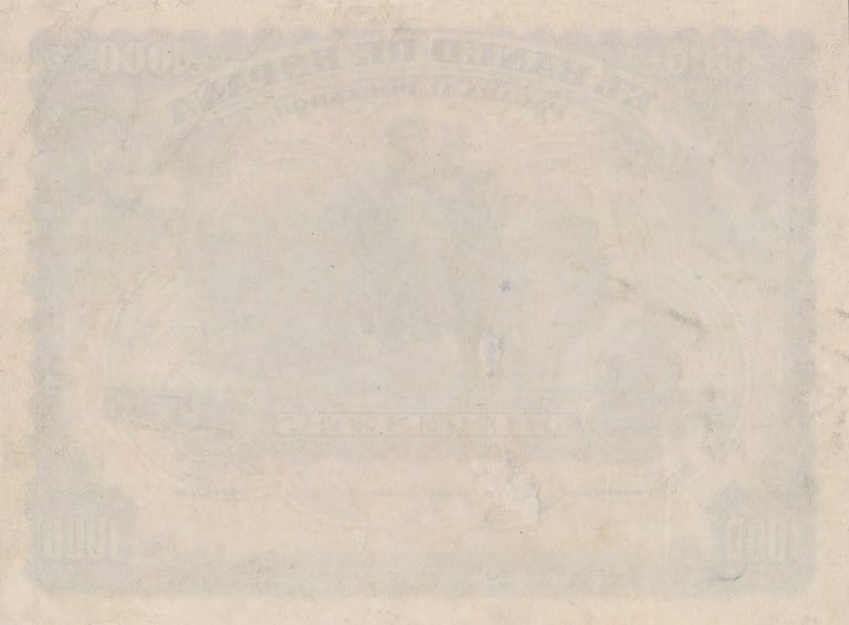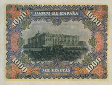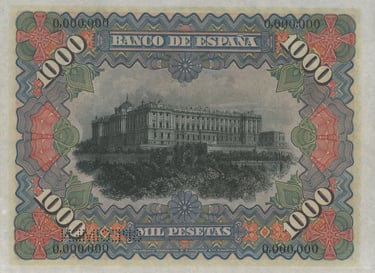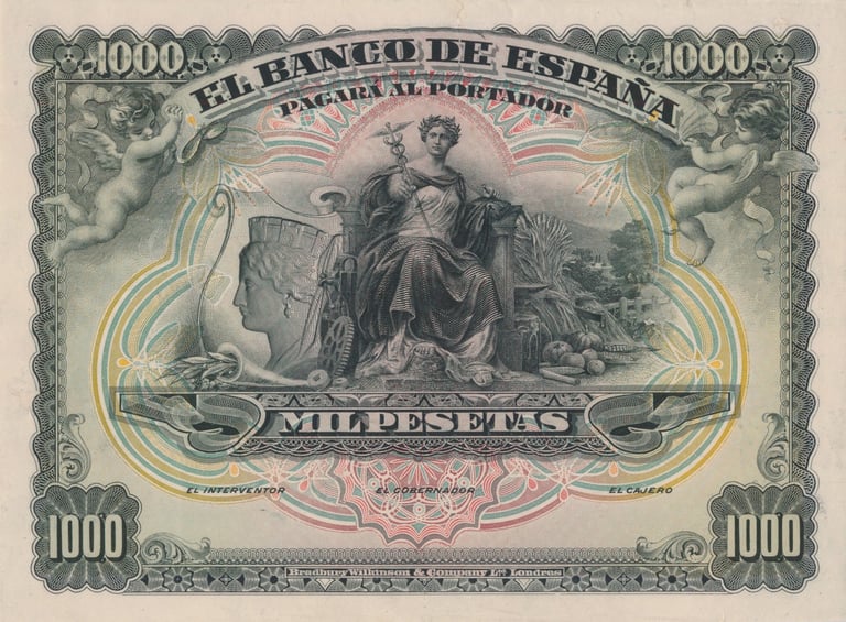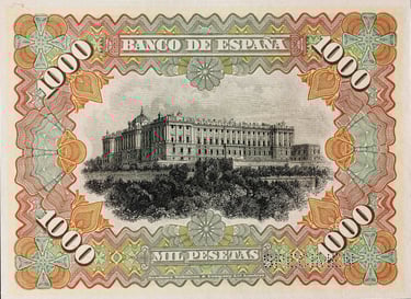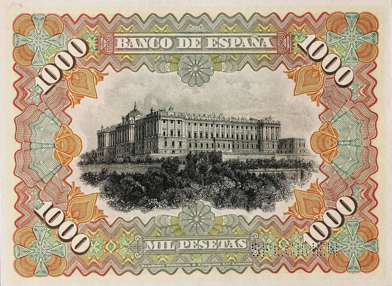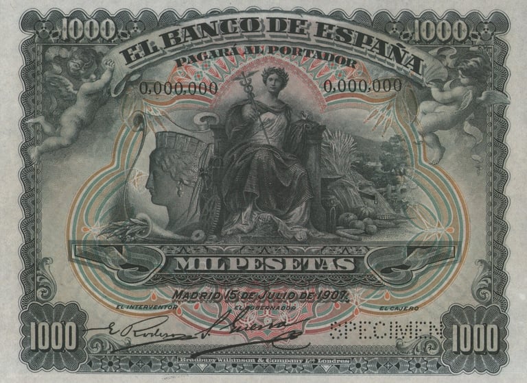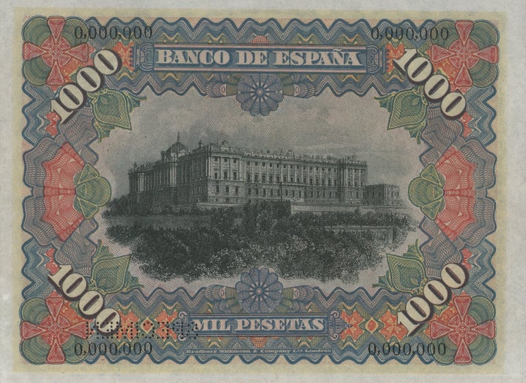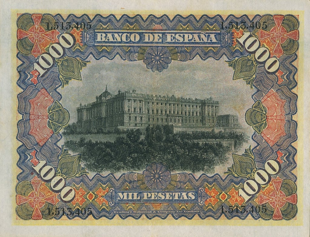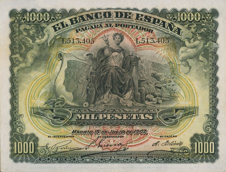 1000 pesetas, 15 de julio 1907. Anverso, “Mercurio entronizado”. Reverso, Palacio Real de Madrid. Impreso en calcografía y litografía por Bradbury Wilkinson and Company.