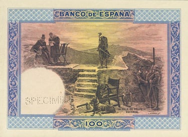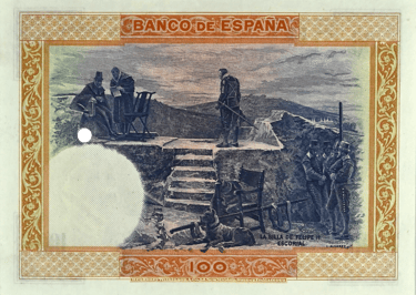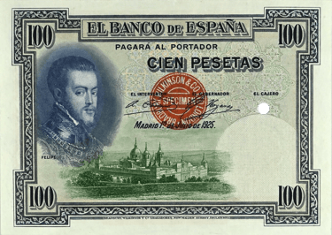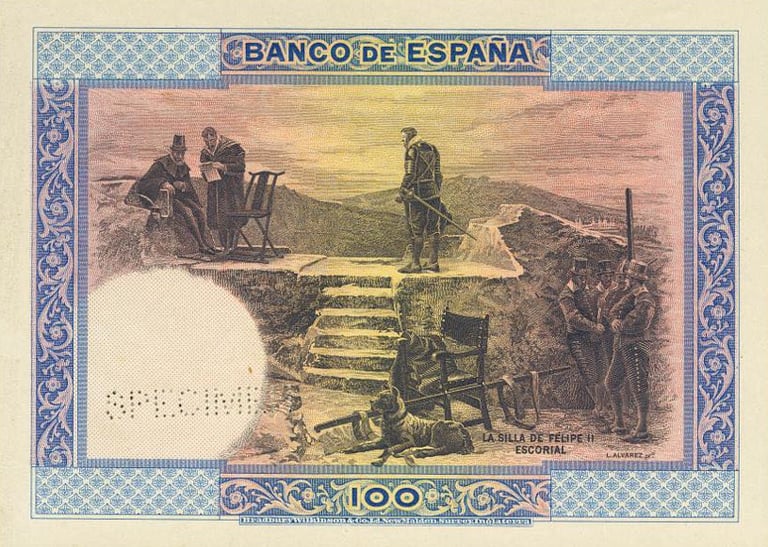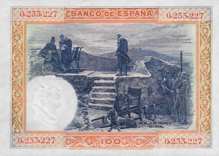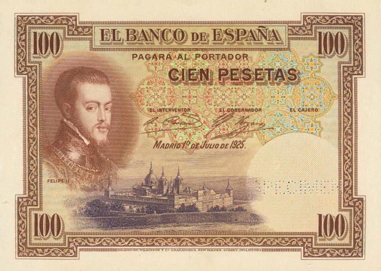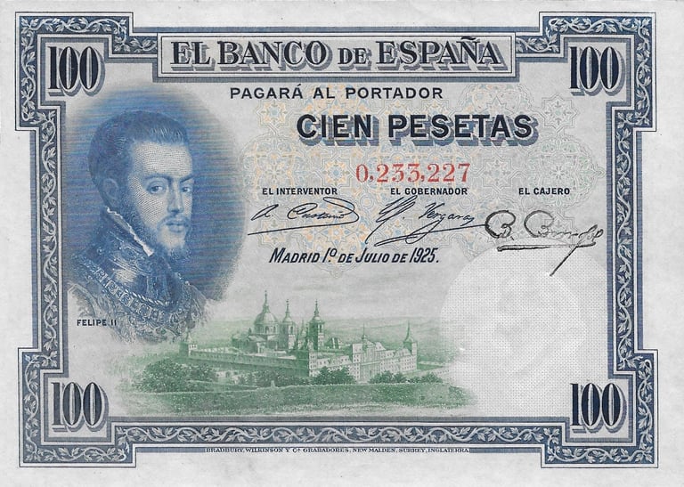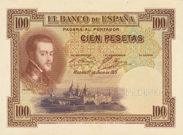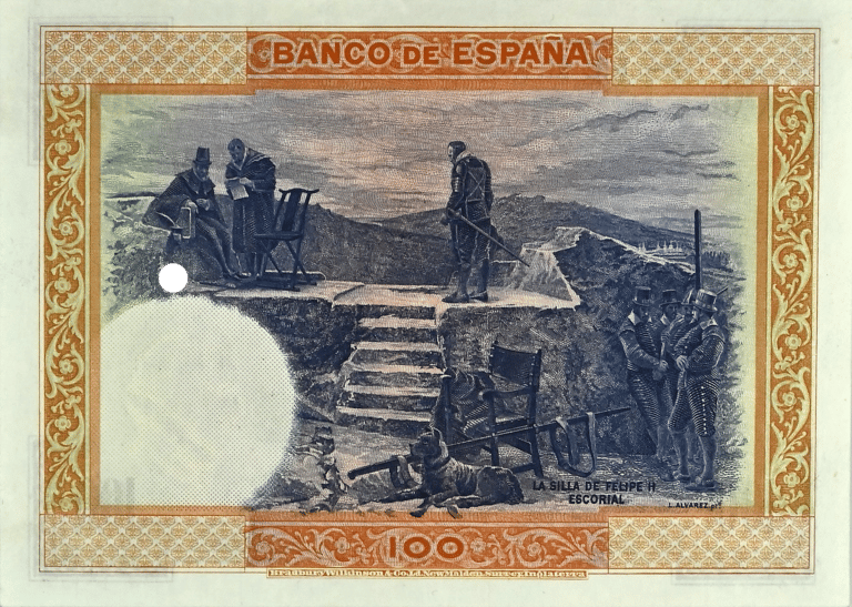 100 pesetas, 1 de julio de 1925. Anverso, retrato de Felipe II, según Tiziano, y monasterio de San Lorenzo de El Escorial. Reverso, “La silla de Felipe II” cuadro del pintor L. Álvarez. Impreso en calcografía y litografía por Bradbury. Marca de agua: Cabeza de