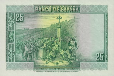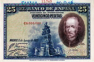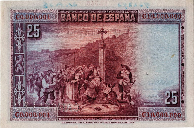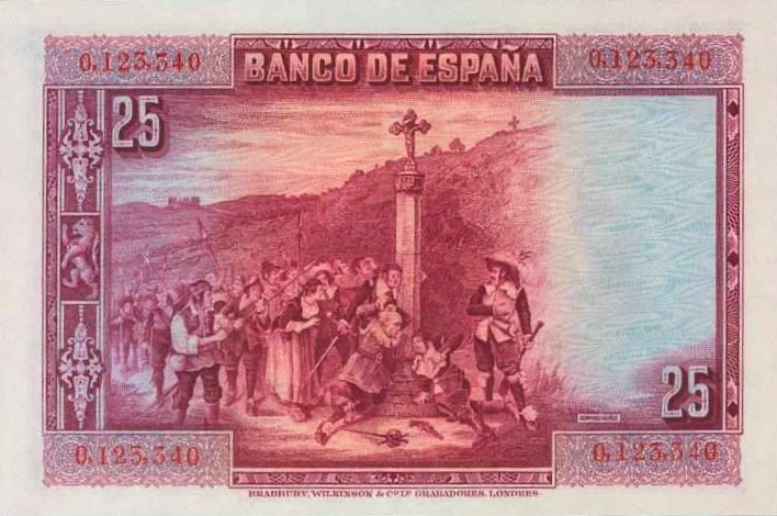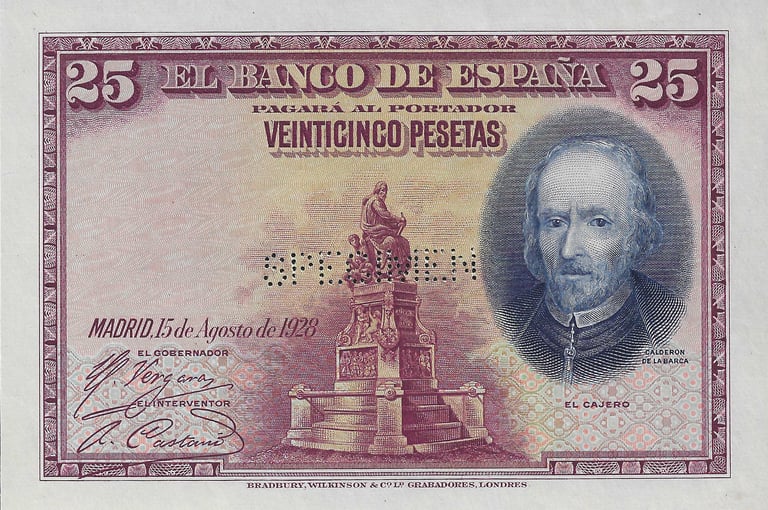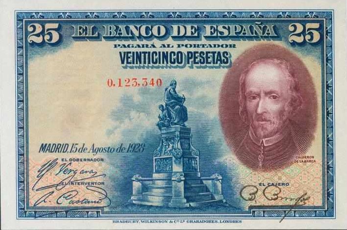 25 pesetas, 15 de agosto 1928. Anverso, Calderón de la Barca y monumento de la Plaza de Santa Ana de Madrid. Reverso, escena de la comedia “La devoción de la Cruz”. Impreso en calcografía y litografía por Bradbury Wilkinson and Company.