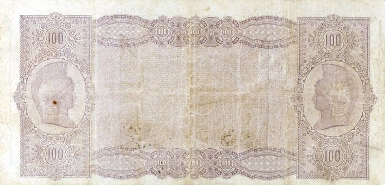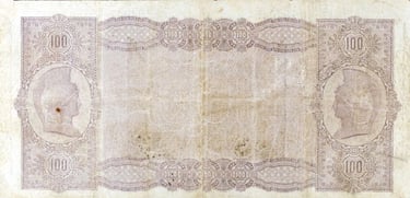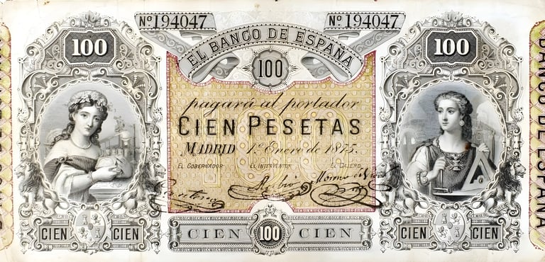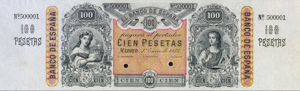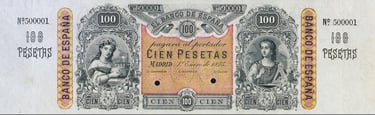 100 pesetas, 1 de enero de 1875. Anverso, alegorías de la ciencia y del arte.