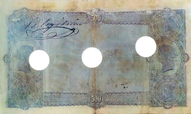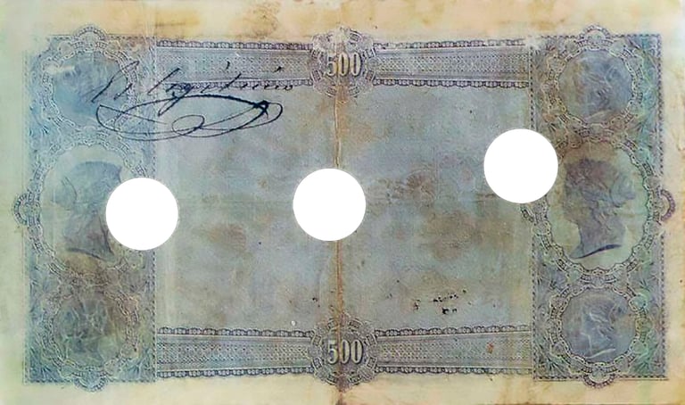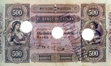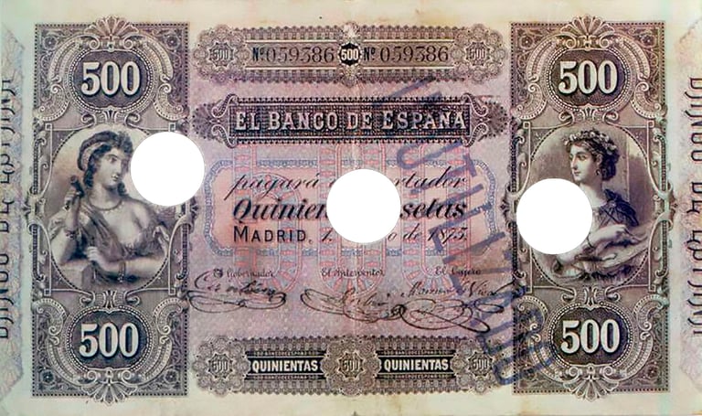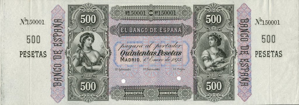 500 pesetas, 1 de enero de 1875. Anverso, alegorías de las artes de la escultura y la pintura. Impreso en calcografía y litografía por la Casa J. H. Sounders de Londres.